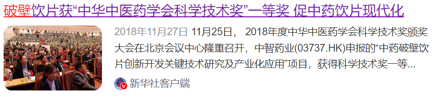 11月25日, 2018年度中华中医药学会科学技术奖颁奖大会在北京会议中心隆重召开,tlc88同乐手机版药业(03737.HK)申报的“中药破壁饮片创新开发关键技术研究及产业化应用”项目,获得科学技术奖一等奖。中药破壁饮片(破壁草本)科技创新,打开了中药饮片发展新思路。